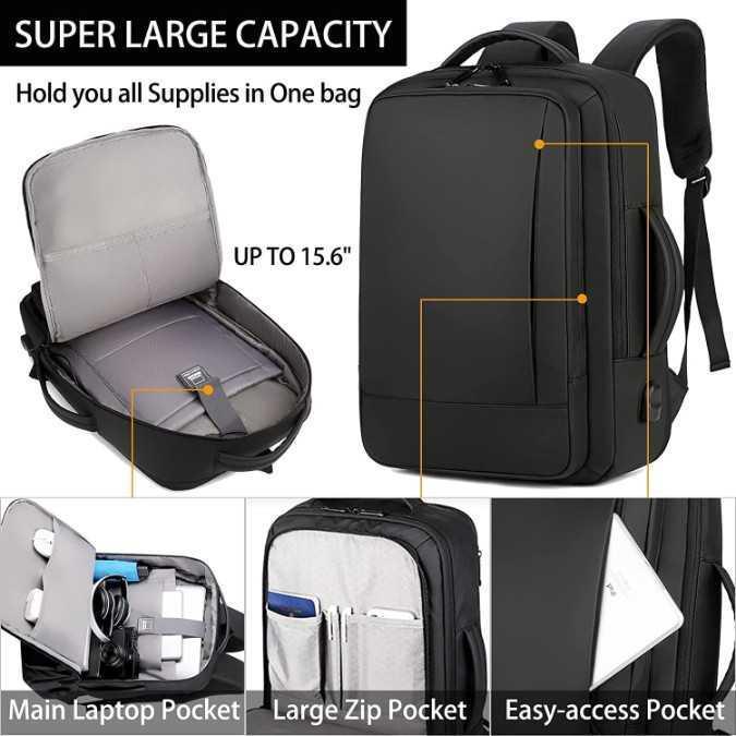 EASY TO ORGANIZE: This travel backpack have 1 x Roomly Main Pocket, 1 x Large Zipper Pocket, 1 x Easy-access Pocket.The main pocket with dedicated laptop compartment for 15.6" laptop, tablet pocket for 10.5" iPad.The main spacious compartment with 2 open pockets can accommodate lots of stuff like travel accessories, essentials.The large zipper compartment with various pockets and the easy-access pocket can store notebooks, pens, keys, earphones and other small items.